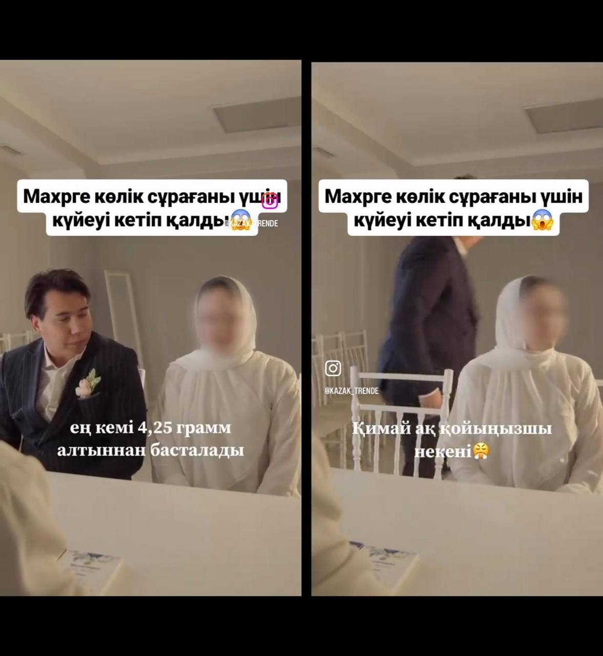 Әлеуметтік желіде неке қию рәсімі кезінде күйеу жігіттің тойды тоқтатып, шығып кеткен сәті тарады. Бұған қалыңдықтың мәһрге қымбат көлік сұрауы себеп болған, деп хабарлайды Qazaqtoday ақпарат агенттігі.