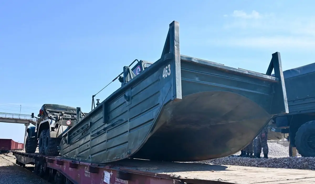 «Понтондық көпір паркінің элементтері теміржол платформасына тиелді, оның ішінде екі үлкен тонналық автомобиль-понтондық көпір сегменттері бар көлік (КрАЗ-255Б), суда жүзетін транспортер және КамАЗ және КрАЗ базасында екі сүйреткіш-моторлы қайық бар. Техниканы майор Наурыз Төлеуовтың басшылығымен 58012 әскери бөлімінің 11 әскери қызметшісінен құралған топ алып жүреді. Мамандар байланыс құралдарымен және қосымша заттармен жабдықталған», — делінген ҚР Қорғаныс министрлігінің хабарламасында.