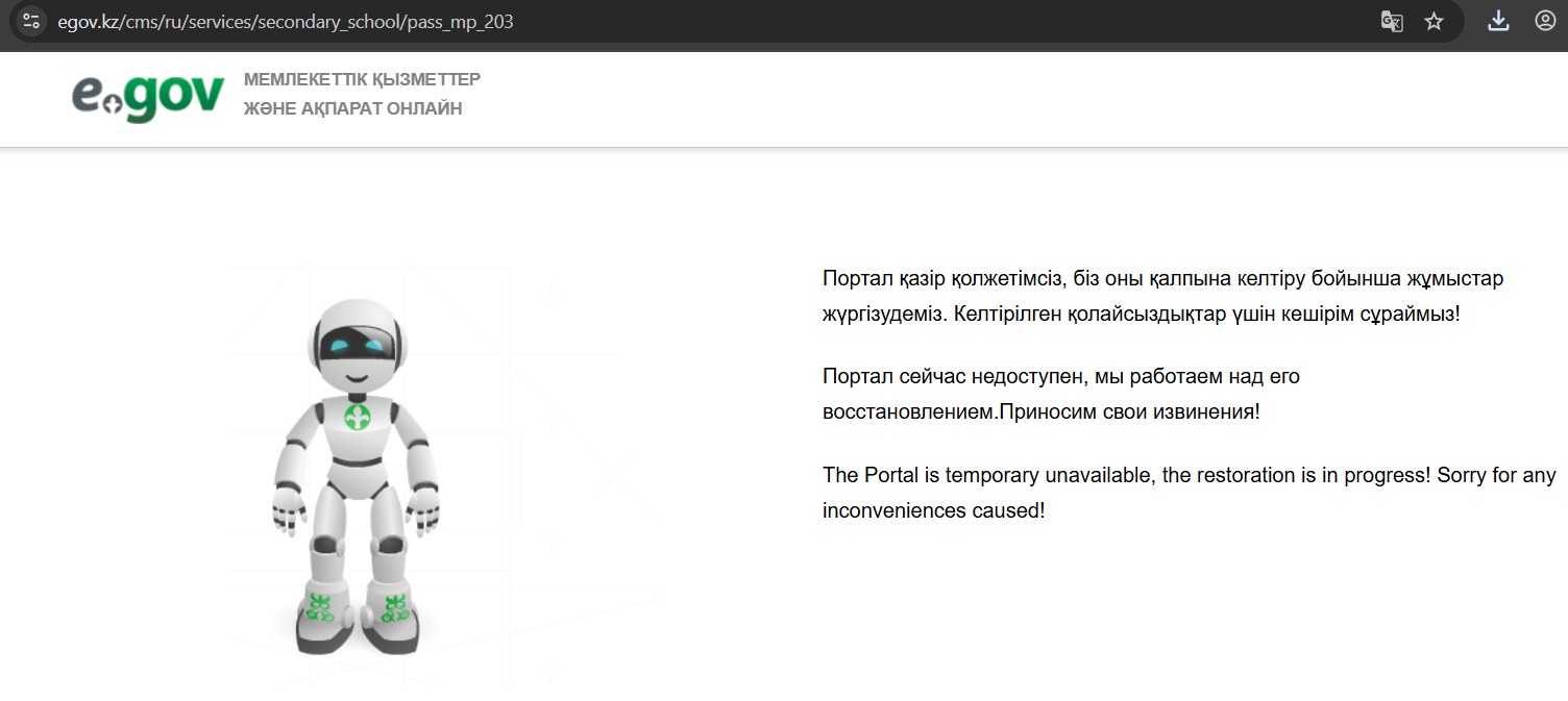 Портал қазір қолжетімсіз, біз оны қалпына келтіру бойынша жұмыстар жүргізіп жатырмыз. Келтірілген қолайсыздықтар үшін кешірім сұраймыз! – деп жазылған.