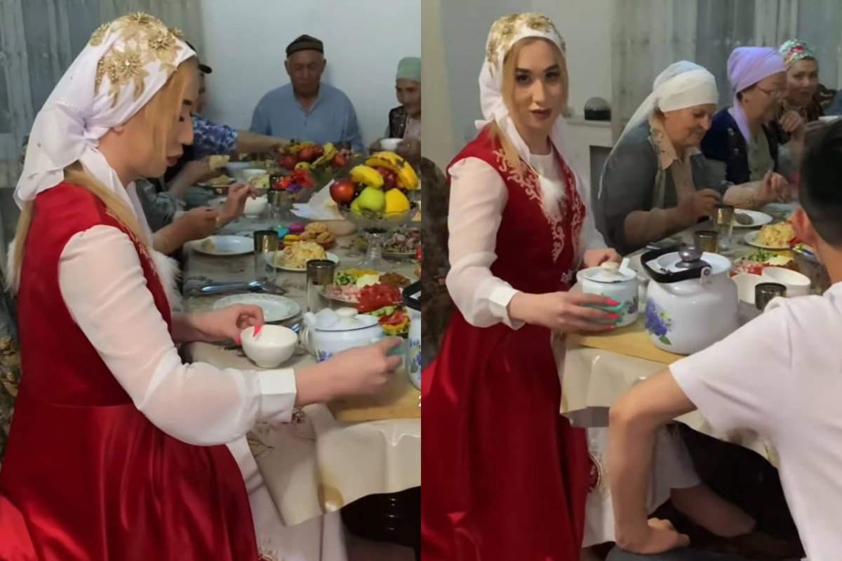Видеода ол «келін» болып қызмет етіп жүрген сәтін көрсеткен.